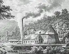 In 1819, the first ever steam engine was installed in a shaft at Ronchamp, capable of lifting 400 skips a day.[5] It was an English engine with a pendulum, condenser, low-pressure piston 0.45 meters in diameter and 10 bhp; it was manufactured in Mr. Rottewel's workshops in Boston. In addition to the extraction coil, this machine operated two sets of 0.19-meter-diameter pumps.[5] In October 1823, the Saint-Louis shaft cut through the first layer of the Stephanian coalfield at around 90 meters from the surface, with drilling stopped at 100 meters.[6] Reaching this depth for the first time in the Ronchamp coalfield, it was nicknamed the "great shaft".[6]