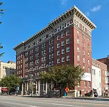 St. Francis High School was founded in downtown Louisville, Kentucky, in 1976, by Tom Pike, a group of parents and board members.[2] Pike, who would be headmaster until he retired, had been Acting Head of School at St. Francis School in Goshen. St. Francis at that time included kindergarten through 9th grade; with this change, it became K-8, and the rising 9th grade migrated to the new high school. The founders chose a site downtown in order to give their adolescent students easy access to cultural institutions and resources such as the main branch of the Louisville Free Public Library and close proximity to the adult world they would soon be joining.[3] St. Francis opened in September 1977 with 60 students and 14 teachers and staff.[4] The school was housed in the historic former Downtown YMCA building at 233 W. Broadway, a 1913 structure in the Beaux Arts style listed in the National Register of Historic Places.[5][6] Originally occupying the building's third floor, the school shared athletic facilities with the Downtown Athletic Club, including the former YMCA's pool, squash court, and indoor track, and basement theater. By 1981, the school had grown to 123 students and 18 teachers, and no longer fit on the third floor. When Holly Wiedemann, a Lexington-based developer who focused on adaptive reuse of historic structures, renovated the building as a mixed-facility incorporating residential, retail, and office space, the school moved the main lobby and offices to the basement level in order to expand classroom space on the 3rd floor.[7]