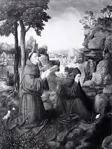 A free copy from some two generations later is in the Prado in Madrid. This is in a vertical format and measures 47 x 36 cm. A large tree is added at the left, and the foreground rocks extended higher. The landscape is somewhat different, and reflects the world landscape style of Joachim Patinir, to whom the painting has been attributed in the past. This was largely because the jagged peaks in the distance have been added to and altered to Patinir's trademark depiction of the distinctive landscape of Dinant, his hometown.[56] This panel was attributed by Max Jakob Friedländer to a "Master of Hoogstraeten", an anonymous follower of Quentin Massys, and dated around 1510.[57] The awkwardness of the figures has been rectified, the placement of his feet and knees "made more rational" according to Rishel, but St Francis stares at the apparition. Another copy, placed tentatively in Brussels c. 1500, is probably a copy of the Turin version.[58]