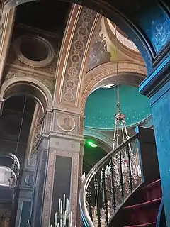 The church's illustrations are limited thematically wise, with few figures of saints, while on several walls are written passages from the Bible. Its impressive gilded iconostasis was a gift from Nicholas of Russia in 1850.[1] The icon-painting was undertaken by the painter Spyridon Hatzigiannopoulos and the entire decoration by the jewelers V. Kottas and A. Pettas (1879-1892).[4]