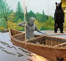 An Onondaga man spears one of the once-plentiful eels from an elm-bark canoe in a display at the Sainte Marie Mission Interpretive Center
