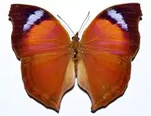 It is a butterfly with a black body covered with orange-brown hair; claviform antennae; above the orange-colored, anterior wings edged with black integrating a bluish-whitish spot; posterior also orange and margins along the veins of the wing brown - black. The underside is gray - black and reminds of a dead leaf, which serves as camouflage; a whitish line runs through the wings of the posterior edge of the hindwing of the anterior edge of the forewing: between this "line" and the body, the wings are darker than between the "line" and the edges of the wings. Its wings are bent.