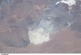The principal salt has variously been stated to be either halite[9] or gypsum in the form of selenite.[10] There are minor amounts of calcium chloride, elemental sulfur[11] and ulexite.[12] The salts form a thick, brine-filled salt formation[13] with domes, mounds,[14] ridges, polygonal cracks,[2] tumuli[10] (an area covered with numerous domes is called "Dome Field"[9]) and a rough crust.[15] A raised area at the eastern end of the salar features small holes draped in gypsum[16] that appear to be produced by degassing.[17] Water at Salar de Pajonales is extremely salty,[18] with calcium chloride and calcium sulfate being the main components.[2] There is evidence of ongoing dissolution of the salt,[7] which has left deep pits[19] and cavities reaching 1–2 metres (3 ft 3 in – 6 ft 7 in) height.[20] The dissolution may be caused by salt draining into groundwater.[21] Salt deposition is influenced by the activity of cyanobacteria and sulfur-oxidizing bacteria,[22] which precipitate gypsum that may entomb microorganisms.[12]