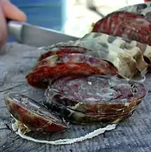 Salchichón is a Spanish summer sausage that is made by smoking, drying, cooking, or some combination.[1] It is made with pork, although some recipes use other meats including ox, veal, or horse.[1]