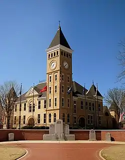 The Saline County Courthouse in Benton, Arkansas is the county courthouse of Saline County. Built in 1901, the courthouse was the third built in the county. Architect Charles L. Thompson designed the building in the Romanesque Revival style, an uncommon design choice in Arkansas. The two-story brick building features a four-story clock tower at one corner, smaller towers at the other three corners, dentillated cornices, and rounded arch entrances. The courthouse has served as Saline County's seat of government since its construction.[2]