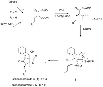 5. 1 2 Beer LL; Moore BS (2007). "Biosynthetic convergence of salinosporamides A and B in the marine actinomycete Salinispora tropica". Org. Lett. 9 (5): 845–8. doi:10.1021/ol063102o. PMID 17274624.
