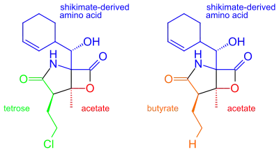 While they share the biosynthetic precursors acetate and presumed β-hydroxycyclohex-2'-enylalanine (3), they differ in the origin of the four-carbon building block that gives rise to their structural differences involving the halogen atom. A hybrid polyketide synthase-nonribosomal peptide synthetase (PKS-NRPS) pathway is most likely the biosynthetic mechanism in which acetyl-CoA and butyrate-derived ethylmalonyl-CoA condense to yield the β-ketothioester (4), which then reacts with (3) to generate the linear precursor (5).