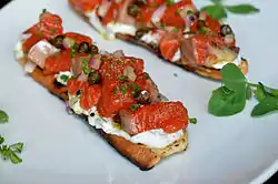 Salmon tartare is prepared with fresh raw salmon and seasonings.[1] It is commonly spread on a cracker[2] or bread[3] and eaten as an appetizer. For the usual preparation in Germany, the chopped salmon fillet is salted and peppered, mixed with finely diced shallots or onions, possibly chives or basil and seasoned with vinegar or lemon juice, oil and spices such as dill or coriander.[4]
