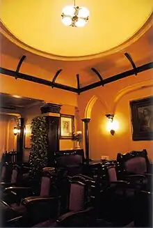 After his release from Yamashina Prison, Tateno decided to remodel the Salon de thé François. Tateno asked an Italian friend, Alexsandro Bencivenni, to design a new interior. Bencivenni was an academic at Kyoto Imperial University who had escaped from fascist Italy. In these days, Fosco Maraini, an Italian ethnologist, also resided at Kyoto Imperial University for the same reason. While Bencivenni worked on the master plan, Shirō Takagi, another friend of Tateno, designed stained glass windows and painted several murals. The interior hall of 40 square meters was arched with a dome 4.5 meters high, which emulated a public room of an ocean liner sailing between Europe and Asia. The decorative motif represented the Italian Baroque style of the 17th century although several columns were designed to represent the style of the Italian Renaissance.