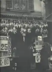 A salumeria in Milan, Italy, in 1930. Poultry products are hanging in front of the store.