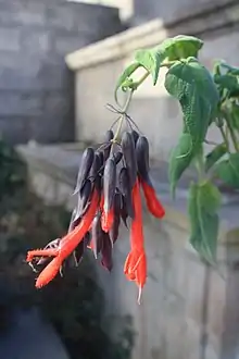 Salvia dombeyi, the giant Bolivian sage, is a tender perennial plant found at approximately 3000 m elevation in Peru, and is a popular subject for gardens. In cultivation, and with proper support, this vining sage can climb from 3–6 m. The heart-shaped dark green leaves have a long petiole with short hairs. The flowers are among the largest salvia flowers, typically at least 8 cm long—with a 4 cm currant-red calyx and a 9 cm scarlet corolla.[1]