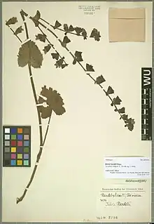 Salvia handelii is a perennial plant that is native to Sichuan province in China, growing on grassy slopes on limestone mountains at 3,800 to 3,900 m (12,500 to 12,800 ft) elevation. S. handelii grows on one or two ascending stems to 50 to 80 cm (20 to 31 in) tall. The leaves are broadly ovate-triangular to subcircular, ranging in size from 8 to 19 cm (3.1 to 7.5 in) long and 4 to 19 cm (1.6 to 7.5 in) wide. Inflorescences are in terminal racemes or raceme-panicles up to 25 cm (9.8 in), with a green-white corolla with violet spots that is 1.8 to 2.2 cm (0.71 to 0.87 in).[1]