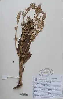 Salvia moorcroftiana is a herbaceous perennial native to the Himalayan mountains from Pakistan to western Nepal, and is especially common in the Kashmir Valley. It grows between 5,000 and 9,000 feet elevation on disturbed areas and open slopes. The leaves are used medicinally in Kashmir.[1]