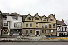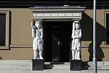 The figures were moved to the building's rear courtyard in 1789, but were placed back at the front door in 1890, by which point the original Hercules sculpture had decayed beyond repair and was replaced by a replica.[1][2] From 1934 until 2003, the building operated as a dance hall and later a nightclub.[1][2] The venue was named Samson and Hercules House during World War II, but later was rebranded to Ritzy's in 1983.[2][3] In the summer of 1992, the Samson sculpture's right arm fell off, prompting Norfolk Museums Service (NMS) to remove the sculptures. They were replaced at the venue with fibreglass replicas in 1998.[1][2] These replicas were at one point painted red when the house became a lobster restaurant,[4] and painted other colours in years since.[5]