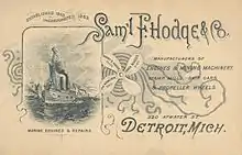 The Samuel F. Hodge & Co. was a manufacturer of marine engines in Detroit. Originally established in 1863 under the name of Cowie, Hodge & Co. In 1865, the firm became Hodge & Christie. In 1870, Mr. Hodge bought the interest of Mr. Christie and continued the business individually. In 1876, during the worst of the depression following the crash of 1873, Samuel F. Hodge built one of the most convenient manufacturing establishments in Detroit, S.F. Hodge & Company, equipping it with a plant second to none. In 1883 it was incorporated as the Samuel F. Hodge & Company. Samuel F. Hodge retained the presidency until his death.[1] They turned out 125 engines between 1884 and 1899. They built the first triple expansion engine to be used on the Great Lakes. It was placed in the Roumania on October 2, 1886.[2] Here also was built the engine for Capt. Hoyt, the first of Capt. Alexander Mc Dougall's whaleback steamers built at West Superior. The engine in the whaleback steamer, Westmore, which attracted much attention in Liverpool when she crossed the Atlantic, was a product of these shops. The great whaleback excursion steamer Christopher Columbus, employed at the World's Fair, received her engine from Samuel F. Hodge & Co. This was said to be the largest single engine of its class on the lakes. Samuel F. Hodge & Co. was located at 308 to 326 Atwater St. East, in Detroit.[3]