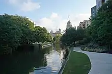 In September 1921, a disastrous flood along the San Antonio River took 51 lives, with an additional 23 people reported missing.[1] Plans were then developed for flood control of the river. Among the plans was to build an upstream dam (Olmos Dam)[2] and bypass a prominent bend of the river in the Downtown area (between present-day Houston Street and Villita Parkway), then to pave over the bend, and create a storm sewer.