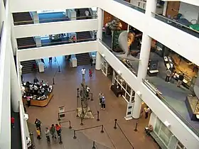 View of the atrium, north side, showing a megalodon shark and entrance to library exhibition.