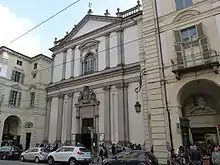 Construction of a church began in 1634 using designs of Pellegrino Pellegrini with the patronage of Christine Marie of France, Duchess of Savoy. It was built adjacent to a convent for monks of the Franciscan order. The church was frescoed both on the interior and exterior of the facade by Francesco Guatier of Saluzzo. The main altarpiece was painted by Tommaso Lorenzoni. In the Chapel of the Holy Trinity, there is a canvas by Sebastiano Taricco. The paintings of six apostles found in the choir, were painted by Bartolomeo Guidoboni. In the last century, the convent was converted into a school.[1]