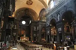 The interior is richly decorated as is customary in Baroque churches. The counterfacade has an organ by Benedetto Tronci of Pistoia. The entrance marble holy water fonts were sculpted in the form of shells supported by angels by Domenico Pieratti. Along the cornice are 14 statues depicting apostles and evangelist, sculpted by Novelli, Caccini, Baratta, Foggini, Piamontini, Pettirossi, Fortini, and Cateni. With each of these statues is a bas-relief depicting an event in the life of each saints.