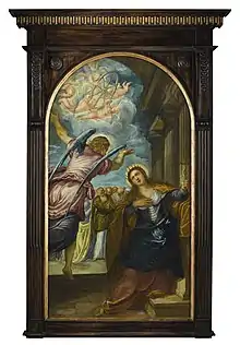 The Scuola di Santa Caterina had an altar within the church, and it had an altarpiece which depicted Saint Catherine of Alexandria by Giovanni Bellini. This was replaced by the painting Angel Foretelling Saint Catharine of Her Martyrdom by Tintoretto in around 1560–70, and the Bellini painting has since been lost.[2] When the church was demolished, Tintoretto's work was acquired by the Galleria dell'Accademia in Florence until it was sold in 1818. It was subsequently in the hands of various private collectors, including David Bowie who purchased it in 1987. Since 2019, the painting has been exhibited at the Doge's Palace on a long-term loan.[7]