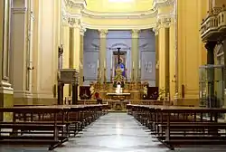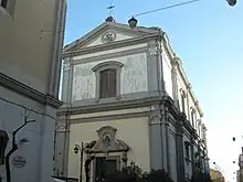 A church at the site was built by the 4th century, and was initially known as "la severiana", after the bishop San Severo of Naples. The present name dates to the 9th century, and is dedicated to a martyred warrior in the battles against the Lombards. In 1640, a fire destroyed part of the church, and reconstruction followed plans by Cosimo Fanzago, who inverted the orientation. The present church's entrance is the former apse of the primitive church. After 1694, it was rebuilt after an earthquake. Cosimo Fanzago transferred into this church some of the granite columns from the nearby church of Santa Maria degli Angeli alle Croci. During the 18th century Risanamiento, when certain streets in Naples were being widened, the nave on the right side of the church was eliminated to widen Via Duomo. Near the lateral door of the church is the marble seat, constructed from spolia, of St Severus, founder of the church. In the left of main altar of the church are frescoes painted by a young Solimena. The church also holds a painting in Byzantine style, a wooden crucifix from the 13th century, and the relics of St Severus. The church has canvases by Camillo Lionti and Francesco Peresi.