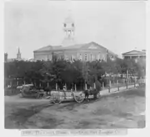 The land for what is now Courthouse Square was deeded to the City of Stockton by C.M. Weber in 1851, and the cost of a new courthouse was to be shared equally between city and county.[3]:191–196 A tax of 14% was enacted to raise funds for the court house and city hall, which was designed by Ayres and Higgins in 1853. The cornerstone was laid on August 6, 1853, and the first courthouse was dedicated on April 17, 1854. Theodore Winters built it for a bid of US$83,920 (equivalent to $2,730,000 in 2022).[4]:182 This first courthouse was approximately 60 ft × 80 ft (18 m × 24 m) and 50 ft (15 m) high.[5]:68 After the Court of Sessions was abolished in 1862, the role of County Judge was held by several others.[2]:83–84