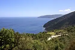 Caleta Manquemapu within the Manquemapu bay, hidden by the hill in foreground is the wreck of the Leucotón. Manquemapu River is right below of the image.