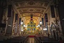 The church structure follows the Baroque style of architecture. Its architectural feature of a single rectangular nave consisting of an apse and sacristy is typical of churches during the Spanish colonial period.[8] The altar with its original carved reredos with motifs of various flowers and fruits following the Baroque Rococo tradition can still be found in the church.[9]