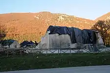 The church was damaged in an earthquake on 24 August 2016, and was closed after being declared structurally unsafe.[4] It was almost completely destroyed in a series of subsequent earthquakes in October 2016, with most of the church collapsing on 26 October and the remaining parts collapsing four days later on 30 October.[5] Only part of the perimeter wall remained, with the rest of the site becoming a pile of rubble. A wooden crucifix and fresco fragments have been recovered from the ruins, and efforts are being made to preserve as many artifacts as possible.[6]