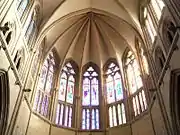 This is a church with a Latin cross, three longitudinal aisles, transept nave and a pentagonal sanctuary. There is no ambulatory. The two gables of the transept house two large rose windows that accentuate the light inside the church. The naves up to the crossing, of which the wider and the highest is the central, are segmented into five rectangular sections covered with four-parts vaults of simple ribbing. The two arms of the transept consist of two sections arched in the same way. The crossing is the only section that features complex ribbing, incorporating tiercerons between the main veins. From the crossing to the head, the naves are extended with three sections. In this posterior space, the four aisles, two on each side, balance the width of the transept, resulting in two separate areas of equal height and divided into six sections separated by four pillars. The slender bell tower, located on the portico of the entrance, is clearly inspired by the spires of the Cologne Cathedral. The set of pilasters and buttresses terminating in pinnacles and spirelets decorated with buds enhance the verticality of the building.