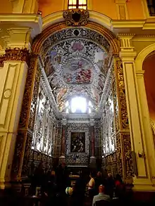 Among the altarpieces in the church is a depiction of the Blessed Geremia (1785) by Antonio Manno in the left transept, and a depiction of Saint Agnes of Montepulciano (1603) by Filippo Paladini. The first chapel on the right transept, dedicated to the Madonna del Rosario, survived the bombardment. It is richly decorated with polychrome marble and small tableux made with stucco (1697-1721) by Gioacchino Vitagliano. These teatrini or dramatic set-pieces depict the scenes of the Mystery of the Rosary. The ceiling is frescoes framed with elaborate stucco with the five glorious mysteries of the Rosary, by Pietro Aquila.[1] These tableux can be compared to the ones made by Serpotta for the adjacent oratory.