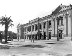 Santa Fe station building and a tram running on Gálvez Boulevard, c. 1940.
