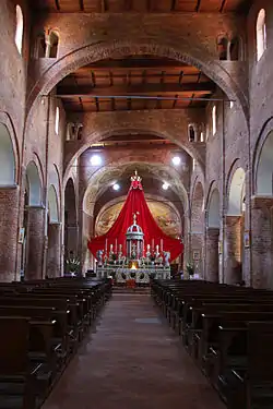 The nave is characterized by arches which, at the sides, have double mullioned windows at the sides. The pillars which do not support the arches are prolonged by blind columns up to the clerestory. The longitudinal arches (those separating the nave from the aisles) are supported by semicolumns which form the pillars. The aisles are a 14th-century reconstruction of the original ones. In 1944 a crypt, perhaps unfinished, was discovered.