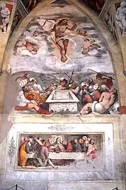 This story presents the important plots of Christ's story: the Crocifissione (Crucifixion) on the counter-façade, the Orazione nell'orto (Oration in the Garden), the Ecce homo, the Andata al Calvario (Going to Calvary) on the north wall, the Resurrezione (Resurrection), the Discesa al Limbo (Descent into Limbo) and the Ascensione (Ascension) on the south wall.[2]