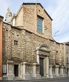 This church was commissioned by the Oratorians. The architect of the domed centralized church was Venetian architect Giorgio Massari. Construction began in 1720 and ended in 1746. The unfinished facade stands in contrast with an opulent interior that includes pink marble Corinthian columns and statues of the apostles by artist Antonio Calegari of Brescia. The nave of the church has two fresco-style paintings painted by Francesco Monti and Giovanni Zanardi.[1] The main altar is flanked by ornate musical organs.