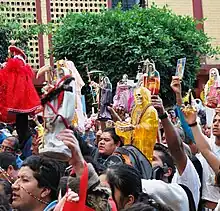 On the first day of every month Enriqueta Romero or one of her assistants lead prayers and the recitation of the Santa Muerte rosary, which lasts for about an hour and is based on the Catholic rosary.[10][35] On the first of November the anniversary of the Tepito Santa Muerte shrine erected by Enriqueta Romero is celebrated. This Santa Muerte is dressed as a bride and wears hundreds of pieces of gold jewelry given by the faithful to show gratitude for miracles granted, or to ask for one.[26]