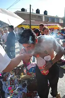 Rituals dedicated to Santa Muerte include processions and prayers with the aim of having a miracle granted.[10] Some believers of Santa Muerte remain members of the Catholic Church,[20] while others are cutting ties with the Catholic Church and founding independent Santa Muerte churches and temples.[39] Santa Muerte altars generally contain one or multiple images of the saint, generally surrounded by any or all of the following: cigarettes, flowers, fruit, incense, water, alcoholic beverages, coins, candies and candles.[21][10] Tobacco is also used for personal cleansing and for cleansing statues of Santa Muerte [40]