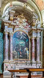 In 1622 the rib vaults of the aisles were put in place, and as soon as they were finished, the great vault of the nave was built.[45] Everything seems to be finished in early 1623.[46] In the same year the new sepulchral ark sculpted by Giovanni Antonio Carra was also installed, finding its place in the center of the chancel.[47] A few months later, the bodies of the two saints were finally moved there during a solemn ceremony.[48] Decorations then began to be discussed: on September 5, 1625[49] a contract was signed with the painters Antonio Gandino and his son Bernardino, who two months later began the drafting of the work in the large panel in the nave.[46] Similarly, in 1626 the painter Tommaso Sandrino began frescoing the rest of the covers starting with the last vault of the right aisle: all work was finished by 1629.[46] In 1630 the tragic "Manzonian plague" occurred, which considerably slowed down the works for at least a decade.[46] Documents mention building works inside the church again only in 1639, when the new ornamentation for the altar of the Blessed Sacrament was commissioned, designed by Agostino Avanzo and made by Giovanni Antonio Carra's sons: Giovanni and Carlo. The affair dragged on quite a bit and the altar could only be finished at the end of the century.[46] In 1643, work began on the rebuilding of the chapel of St. Honorius, at the head of the right aisle, supported financially by the powerful Calini family, which had acquired the sepulchral area in front of it with the commitment to renovate the chapel's furnishings and architecture.[50] Antonio Comino again took care of the matter, but it was to be his last work: the architect died the following year.[51] On the other hand, the construction of the altar of St. Benedict, the third on the left, by Giovanni Carra[46] began in 1649. At the end of the century, the altar of the Nativity was also put in place at the hands of Santo Calegari the Elder: when the work was completed, the canvas by Lattanzio Gambara, made almost a century and a half earlier, was mounted inside it.[52]