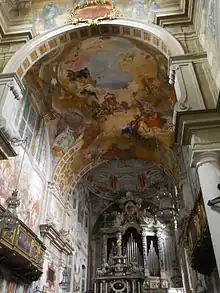 All the ceilings of the hall, both the central and side vaults, are completely frescoed with the illusionistic architecture of Tommaso Sandrino,[78] complemented by scenes by other authors. The extensive fresco on the nave consists of a continuous balustrade, supported by corbels, on which rest mighty Solomonic columns supporting a false ceiling, ideally higher and deeper than the real one. The basic balustrade is not linear, but follows a continuous ascent and descent of faux staircases that bypass the open lunette windows at the base of the vault. Finally, the whole is largely embellished with various decorations and architectural motifs. The work of Antonio Gandino and his son Bernardino is the large central panel, depicting the Glory of the martyred saints Faustinus and Jovita. The fresco depicts the two saints as they ascend to heaven in the presence of the Trinity amid a riot of musician angels. The two ascending saints wear transparent, fluttering white robes and wear stoles in the manner of the priestly Faustinus and the diaconal Jovita, so as to make specific the identity of each according to the data of tradition.[78]