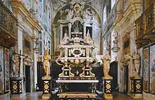 Reconstruction work began from the chancel, which in 1604 was lowered through the destruction of the crypt, relocating the relics kept there.[33] Those of the two patron saints were still in the marble ark of Ramperto, enriched by the small columns added more than a century earlier: the whole was, for the time being, simply reassembled in the new presbytery.[32] Likewise, the relics and altar of St. Honorius were moved and reassembled in the back chapel of the right aisle.[34] The final impetus for the continuation of the renovations came unexpectedly from the Municipality of Brescia, which on November 14, 1609 resolved to build, using public money, a new sepulchral ark of the two saints, in the opinion of the councilors by then unsuitable and worthy of greater attention to keep up popular devotion.[32] The contract with sculptor Giovanni Antonio Carra was signed in 1618, finally paving the way for the radical reconstruction of the church.[35]