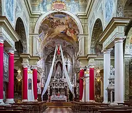 In the meantime, the interior of the church was enriched: the altar of Santa Maria in Silva was built to replace the previous wooden altar, increasing the depth of the chapel in order to have more space, completing the work in 1726.[58] Meanwhile, in 1735 the two large wooden chancels were rebuilt and installed, incorporating the painted cartouches that already adorned the previous chancels. The reason for the rebuilding, however, is not known.[59] The church, at this point truly completed, was to know within a few years a great tragedy.