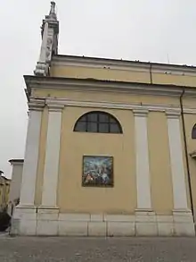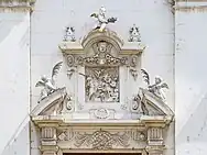 The four lesenes are not equidistant, but the central intercolumn is wider to accommodate the entrance portal to the church. Two free-standing Tuscan columns, resting on a high pedestal, frame the opening, while the upper entablature is covered with a rich decoration of plant motifs. This is followed by a low arched pediment immediately broken to allow the elevation of a rich crest, decorated with putti, volutes and floral motifs. In the central panel is the Martyrdom of Saints Faustino and Giovita by Santo Calegari the Elder, a marble high relief with iron inserts, usually remembered as one of the great masterpieces of Brescian Baroque sculpture.[56] Of great effect within the scene is the figure of the executioner completely in relief, whose drawn sword, made of iron, even protrudes outside the frame. In the space between the two lesenes on the side of the portal, on the other hand, statues of the two titular saints, again the work of Santo Calegari,[56] are placed within niches. Inside the upper pediment, on the other hand, is placed a rich Baroque cartouche, one among the pieces made personally by Giuseppe Cantone.[57]