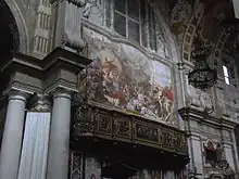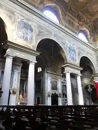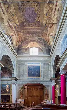 However, the grand project almost immediately suffered a major setback, caused by the tragic events of the reconquest of Brescia by Milan at the hands of the French, which would end with the bloody sacking of 1512.[26] The building revival of the monastery, most likely, was not to take place in the years immediately following, as Venice regained possession of the city once again: from 1520 onward, however, the works experienced intense activity.[27] In 1532 the organ by Gian Giacomo Antegnati was installed, while the structures of the monastery, especially the cloisters and the new dormitory, were substantially completed.[27] However, in the second half of the century, Lattanzio Gambara frescoed the entire presbytery area: his work would be admired a few years later, in 1566, by Giorgio Vasari, who was visiting Brescia.[28][29] Meanwhile, master builder Geronimo Tobanello, who was already working in other areas of the monastery, took care of the first adaptations of Renaissance architecture inside the church, affixing on the walls of the aisles, around the chapels, a rhythmic succession of marble lesenes, all designed by Giovanni Maria Piantavigna.[28] The first chapel on the right was also renovated, building a new altar reusing parts of the old one and dedicating it to St. Michael the Archangel.[28] The work was taken over during the visit of St. Charles Borromeo in October 1580,[30] who took note of both the embellishment lesenes and the new chapel and ordered that the north wall of the church, which had remained intact up to that time, be broken through to create three new mirrored chapels.[31]