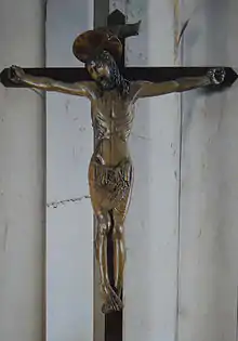 After the Second World War ended, work was resumed in the church in 1949: the back chapel of the right aisle, until then the chapel of St. Honorius, was modified and converted into a baptistery: the altar and furnishings were dismantled and moved to storage, the saint's relics moved to the mirror chapel of the left aisle, and the only painting present, a canvas by Antonio Gandino, was kept and re-hung on the wall of the new chapel.[65] Finally, in 1952 the new baptismal font, the work of sculptor Claudio Botta, was installed.[66]