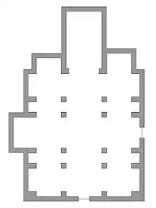 In 1957, major archaeological excavations were conducted under the church sacristy:[67] the entire wall of the northern flank of the Romanesque church was brought to light and with it an apse of the crypt demolished in 1601: the wall fragment, about one meter high, was still decorated by the fifteenth-century frescoes commissioned by Abbot Bernardo Marcello.[67] Lower down, however, an earlier decoration emerged, in votive panels with figures of saints.[68] An ancient Roman funerary stele, carved with four figures in a row, three men and a woman, surmounted by a triangular pediment, was also found in the foundations. The work was dismembered and transferred to the Santa Giulia Museum.[68] Another reused Roman stele was also found, consisting only of an inscription.[69] Both finds were dated to the first century.[68][69]