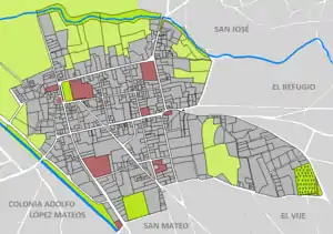 Since 1999, the city has been divided into 2 administrative Agricultural colonies (colonias ejidales in Spanish),[5] is urban sectors consolidated in the 20th century on communal land by farmer's son homes :
