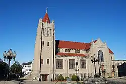 The Gothic Revival-style church building was built in 1924–27 to a design by the architectural firm of Murphy & Hindle. It is stylistically subdued, but has fine stained glass windows, a tile roof with copper coping, and cast stone pinnacles.[2]