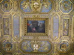 The Ceiling has six paintings on wood depicting episodes historic events in which the military order was active, including the Granting of uniforms by Cosimo I de' Medici by il Cigoli, the Return of the Fleet from the Battle of Lepanto and Sacking of Prevesa by Jacopo Ligozzi, The embarcation at Livorno of Maria de' Medici by Allori, Victory in the Greek Archipelago and Capture of Bona by l'Empoli,