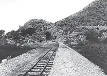 The first measurements began in 1879, and in the summer of 1884, the construction of the first section from Metković to Mostar began, for which all the material was brought via the port in Metković.[11] The most difficult part of this section was from Buna to Čapljina, a length of 19-kilometre (12-mile), because it passed through the Neretva canyon, which was difficult to access, so an auxiliary road was also built for construction purposes. From Gabela to Metković, due to the flooding of the Neretva, the railway was built on an embankment. In this section, the width of the upper embankment was 3 metres (9.8 ft). The rails weighed 17.8 kg per meter in length and the tunnels were built with a width of 3.3 metres (11 ft) and a height of 3.1 metres (10 ft). The capacity of the section was 30 trains in 24 hours, and the maximum speed was up to 18 km/h. Although this speed corresponded to a minimum radius of 71 metres (233 ft), the built minimum radius was 100 metres (330 ft).[12]