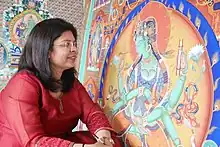 Dr. Sarika Singh, Thangka artist, Teacher and Co-Founder of Center for Living Buddhist Art, Thangde Gatsal Studio and Himalayan Art Museum, Dharamshala; alongside her Alchi Tara Thangka.[1]